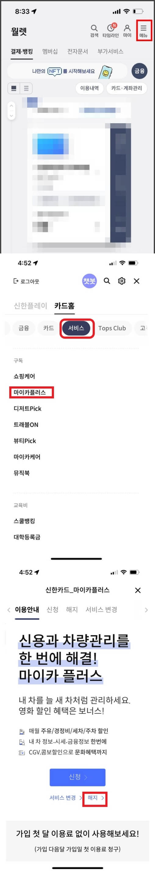 - [서비스] > [구독] > [마이카서비스] > [해지] 버튼 클릭